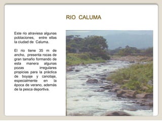 El documento describe varias cascadas y el bosque protector Naranja Pata ubicados cerca de la ciudad de Caluma, Ecuador. Describe las características de las cascadas La Tres Pailas, La Chorrera, Plomovado Pequeña, Plomovado Grande, así como el bosque protector Naranja Pata. También menciona el hermoso atardecer que se puede observar en Caluma.