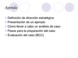 Este documento presenta una guía para el análisis de casos de dirección estratégica. Explica la definición de dirección estratégica según varios autores y provee un ejemplo del caso de Robin Hood. Luego, detalla los cinco pasos para analizar un caso: 1) familiarizarse con el material, 2) identificar problemas, 3) realizar análisis estratégicos, 4) proponer soluciones alternativas, y 5) hacer recomendaciones. Finalmente, describe cómo los casos son evaluados según siete criterios como la identificación