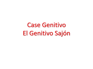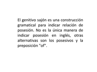 El documento explica cómo se forma el genitivo sajón en inglés para indicar posesión. Se puede formar mediante la preposición "of" o añadiendo un apóstrofo y una "s" al nombre del poseedor. El genitivo sajón se usa comúnmente con nombres de personas, animales, países y expresiones de tiempo.