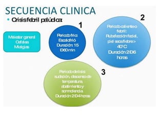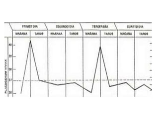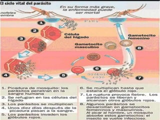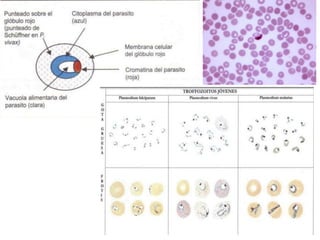 El documento describe la malaria, incluyendo las especies más comunes de Plasmodium que la causan, sus síntomas como fiebre y escalofríos cada 48 horas, y su tratamiento con cloroquina y primaquina.