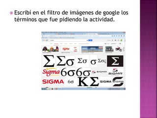 El documento describe los resultados de una búsqueda avanzada en Google Images usando diferentes términos relacionados con "sigma". Al escribir solo "sigma" se mostró la letra griega. Al añadir "menor" se encontraron imágenes sobre el concepto de sigma y su logotipo. Al añadir "antigua" se mostraron máquinas de coser antiguas de la marca Sigma. Al combinar términos como "sigma menor antigua" o "sigma antigua y conservada", los resultados fueron más específicos e incluyeron máquinas