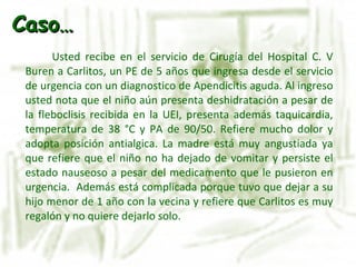 El documento describe el caso de Carlitos, un niño de 5 años que ingresó al hospital luego de una cirugía de apendicectomía. Presenta deshidratación, taquicardia, fiebre y baja presión arterial. El resumen debe incluir la valoración inicial del paciente, los diagnósticos de enfermería identificados y el plan de cuidados para el diagnóstico prioritario de alteración de la mecánica ventilatoria.