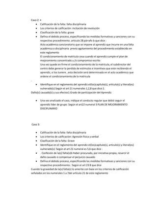 El documento presenta tres casos de faltas disciplinarias cometidas por aprendices. En el primer caso, la falta se califica como grave por incitación a la revolución. En el segundo caso, la falta se califica como grave por daños causados y falta de seguimiento del conducto regular. En el tercer caso, la falta se califica como grave por agresión física y verbal, y falta de reconocimiento y reparación del daño causado. En cada caso se identifican los artículos del reglamento vulnerados y se define el debido proceso a seguir según las medidas format