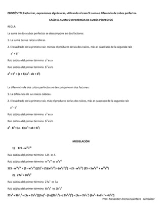 Este documento explica cómo factorizar expresiones algebraicas que son la suma o diferencia de cubos perfectos. Indica que la suma de cubos perfectos se puede descomponer en dos factores: la suma de las raíces cúbicas y el cuadrado de la primera raíz menos el producto de las raíces más el cuadrado de la segunda raíz. La diferencia de cubos perfectos se descompone en dos factores: la diferencia de las raíces cúbicas y el cuadrado de la primera raíz más el producto de las raíces más el cuadrado de