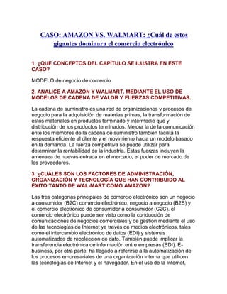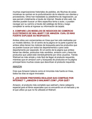 Este documento analiza y compara los modelos de negocio de comercio electrónico de Amazon y Walmart. Describe cómo ambas compañías han utilizado cadenas de suministro y fuerzas competitivas para tener éxito en este campo. También discute los factores tecnológicos y organizativos que han contribuido a su éxito, como la automatización de procesos internos y el enfoque en las relaciones con clientes. Finalmente, concluye que aunque los modelos de negocio son similares, Amazon sigue siendo el minorista en lí
