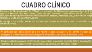 Una paciente de 24 años en embarazo presentó dolor abdominal y fue inicialmente diagnosticada erróneamente con infección de vías urinarias, evolución que llevó a una apendicectomía complicada por apendicitis aguda. La cirugía fue abierta debido a un diagnóstico tardío, y aunque la herida se clasificó como contaminada, no ha mostrado complicaciones postoperatorias hasta el primer día tras la intervención. El pronóstico es óptimo, con cuidados postoperatorios adecuados y sin evidencia de infección ni otros problemas.