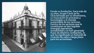 Grupo Carso es uno de los conglomerados más grandes de América Latina, conformado por cuatro sectores estratégicos: comercial, industrial, infraestructura y construcción, y energía. Tiene una importante presencia en la economía mexicana donde se mantiene como líder de mercado gracias a su portafolio de formatos, productos y servicios. Su estrategia de sustentabilidad busca promover la creatividad empresarial y solución de problemas basada en el desarrollo humano, formación del personal, optimismo, trabajo en equipo