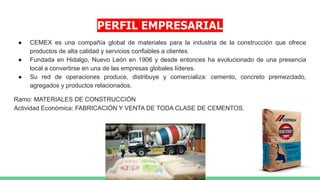 CEMEX es una compañía global líder en materiales para la construcción fundada en México en 1906. Produce, distribuye y comercializa cemento, concreto, agregados y productos relacionados. Su misión es proveer productos y soluciones líderes para satisfacer las necesidades de construcción de sus clientes a nivel mundial. Para lograrlo, ha utilizado estrategias como la innovación, eficiencia operativa, adquisiciones y expansión internacional.
