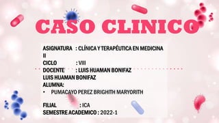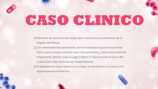 Este documento presenta el caso clínico de un niño de 6 años con fiebre alta, dolor abdominal, vómitos y diarrea. Los exámenes revelaron anemia, leucocitosis, aumento de las enzimas hepáticas y derrame pleural. La tomografía mostró hepatomegalia, enteritis e ileítis. El cultivo de sangre identificó Salmonella typhi, lo que llevó al diagnóstico de fiebre tifoidea. Se inició tratamiento con antibióticos.