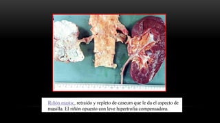 Este caso clínico describe una paciente con tuberculosis renal y genitourinaria. Presenta síntomas urinarios como disuria e incontinencia durante varios años. Exámenes de orina muestran leucocituria recurrente. La tomografía y el renograma isotópico confirman exclusión renal derecha y signos de pielonefritis crónica izquierda. Se realiza nefrectomía derecha y el examen anatomopatológico muestra tuberculosis renal. Más adelante se diagnostica tuberculosis pulmonar activa.