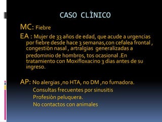 Este caso clínico describe una paciente de 33 años que acudió a urgencias con fiebre de 3 semanas, cefalea, tos y artralgias. Las pruebas mostraron lesiones pulmonares múltiples, adenopatías y elevación de los niveles de ANCA. La biopsia nasal y cutánea confirmaron granulomatosis de Wegener. El tratamiento incluyó corticoides, ciclofosfamida e inmunosupresores para controlar la vasculitis sistémica necrosante.