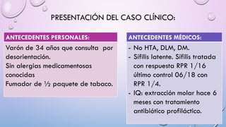 El paciente, un varón de 34 años, acudió desorientado y con cefalea. Las pruebas mostraron un cuadro de meningitis linfocítica. El diagnóstico final fue neurosífilis latente, la cual fue tratada exitosamente con ceftriaxona durante 14 días.