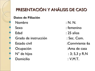 Este documento presenta el caso clínico de una mujer de 25 años que fue abusada sexualmente por su padre cuando era niña. Sufre de depresión y baja autoestima como resultado del abuso y su disfuncional dinámica familiar. La evaluación psicológica indica tendencias ansiosas y depresivas, con dificultades en las áreas social, emocional y familiar. Se recomienda psicoterapia cognitivo-conductual para fortalecer su autoestima, control de ansiedad y habilidades sociales.