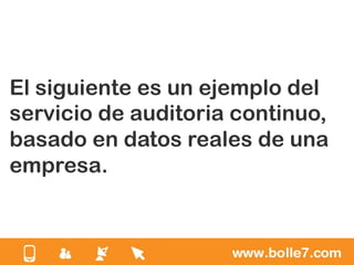 Este documento presenta un caso de éxito de auditoría continua para una empresa, mostrando ahorros potenciales a través de la optimización del uso de servicios de voz, datos e Internet. Actualmente la empresa gasta $25.4 millones por mes en estos servicios, pero una auditoría encontró que podría ahorrar hasta $43.6 millones anualmente reduciendo el uso innecesario y cambiando a planes más adecuados. Esto podría lograrse optimizando el uso de voz, datos móviles y mensajes de texto, lo que reduciría