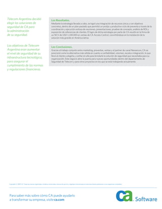 Telecom Argentina eligió las soluciones de seguridad de CA para mejorar su infraestructura tecnológica y cumplir con las normativas SOX y PCI, resultando en la mayor implementación de CA Access Control en América Latina. A través de una estrategia de colaboración con su CISO y el uso de un aliado estratégico, se logró una integración exitosa que culminó en la firma de un contrato por 1.1 millones de USD. Esta asociación posicionó a CA como un proveedor confiable para futuras oportunidades en seguridad dentro de Telecom Argentina.
