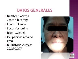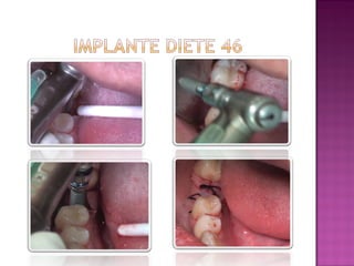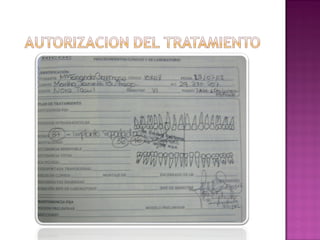 El documento presenta la historia clínica de una paciente de 53 años que acude a colocarse implantes dentales. Presenta ausencia de varios dientes, obturaciones desajustadas y fracturas. Se propone realizarle educación en salud oral, profilaxis, colocación de resinas y dos implantes dentales en las posiciones 36 y 46.