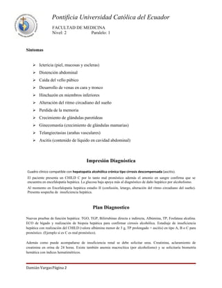 Este documento presenta el caso de un paciente hombre mayor con cirrosis hepática descompensada probablemente causada por el consumo crónico de alcohol. El paciente presenta síntomas como ictericia, distensión abdominal, caída del vello púbico, entre otros. Los exámenes de laboratorio muestran niveles elevados de bilirrubina y aminotransferasas, así como bajos niveles de albúmina y glucosa, lo que es compatible con un diagnóstico de cirrosis hepática. Se propone realizar pruebas adicionales como ec