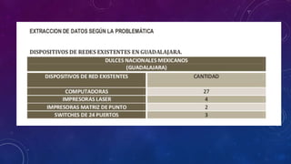 Este documento describe la red actual de una empresa con una sede principal y dos sucursales de producción. La red de la sede principal usa cableado no estructurado con 27 computadoras conectadas a través de 3 switches. No hay políticas de uso de red o equipos. Se recomienda instalar cableado estructurado, descartar impresoras obsoletas, usar solo 2 switches, instalar software de control y respaldo, filtrar el acceso a Internet, reemplazar el cableado, agregar antivirus, instalar un servidor y distribuir la red en subredes.