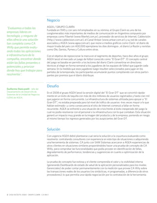 AGEA lanzó el juego online "El Gran DT" que tuvo éxito con más de 2 millones de usuarios, pero su infraestructura no podía soportar tal tráfico. CA Wily permitió monitorear el desempeño, identificar fallas y mejorar la escalabilidad para soportar el crecimiento sin caídas, resolviendo la crisis e impulsando el negocio de AGEA. CA Wily y SAM Sistemas ahora son socios estratégicos del Grupo Clarín.