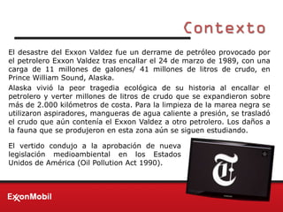 El petrolero Exxon Valdez derramó 41,600 toneladas de crudo en el Prince William Sound de Alaska en marzo de 1989. Este desastre ecológico afectó más de 2,000 km de costa y llevó a la aprobación de nueva legislación ambiental en Estados Unidos. Exxon inicialmente negó responsabilidad y tuvo dificultades para manejar eficazmente la crisis de reputación, lo que perjudicó seriamente su imagen.
