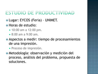 El documento resume los resultados de un estudio de tiempos realizado en una imprenta universitaria. Se midieron los tiempos de diferentes procesos como la toma de pedidos, impresión y cobro, encontrando tiempos promedio de 72, 87 y 92 segundos respectivamente. También se analizaron factores como la capacidad de las máquinas de impresión y el número de trabajadores.