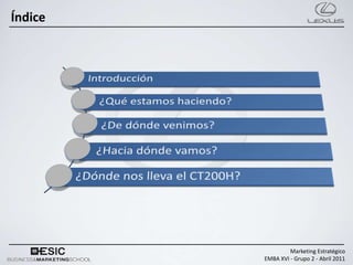 El documento describe el lanzamiento del Lexus CT200h, el primer compacto premium híbrido del mundo, en España. Se analiza el segmento, posicionamiento y tendencias del mercado de vehículos de lujo para determinar cómo posicionar el CT200h. Se realizó una investigación de mercado cualitativa y cuantitativa para entender cómo es percibida la marca Lexus y sus atributos.
