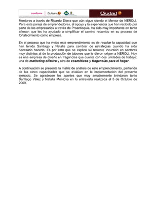 El documento describe el origen y desarrollo del emprendimiento NEROLI en Medellín. NEROLI comenzó cuando Natalia Montoya elaboraba jabones artesanales como hobby y luego recibió un pedido grande de un hotel, lo que la llevó a constituir la empresa legalmente con su novio Santiago Vélez. Con el tiempo, NEROLI expandió su oferta a cosméticos y fragancias para el hogar. El emprendimiento recibió apoyo de programas como Jóvenes con Empresa y Proantioquia que los ayudaron a profesionalizar y