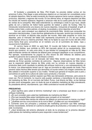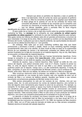 Nike ha construido uno de los logotipos más reconocibles del mundo a través de grandes inversiones en marketing y patrocinios deportivos. La compañía vende no solo productos deportivos, sino también un estilo de vida y cultura del deporte. Para mantener su dominio global, Nike busca expandirse a nuevos mercados como el fútbol.