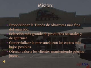 Este documento presenta la misión, estrategia y perspectivas de mercado de una tienda de abarrotes. Su misión es ofrecer la más fina selección de productos naturales y de gourmet a precios justos. Su estrategia es operar de manera independiente y confiar en el talento de sus empleados. Las perspectivas de mercado incluyen el crecimiento de tiendas mayoristas y comidas rápidas, así como nuevos modelos de compra en línea.