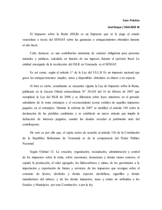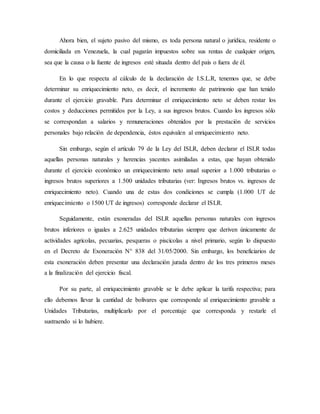 El Impuesto sobre la Renta (ISLR) es un impuesto que se paga al estado venezolano sobre las ganancias obtenidas durante el año fiscal. Deben declarar el ISLR las personas naturales o jurídicas con un enriquecimiento neto anual superior a 1.000 unidades tributarias o ingresos brutos anuales superiores a 1.500 unidades tributarias. El sujeto activo es el Poder Público Nacional y el sujeto pasivo son las personas naturales o jurídicas residentes o domiciliadas en Venezuela.