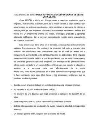 Este documento describe los problemas que enfrenta una empresa de jeans llamada Latin Jeans, incluyendo bajas ventas, maquinaria obsoleta, deuda excesiva y falta de compromiso de los empleados. Se propone un plan de acción de varios pasos para abordar estos problemas renovando el diseño de los jeans, mejorando la eficiencia de producción, evaluando el rendimiento de los empleados, identificando la competencia y estableciendo alianzas estratégicas con otras empresas líderes en el mercado de jeans.