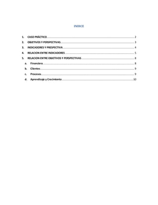 Este documento presenta la elaboración de un cuadro de mando integral para una empresa industrial. Incluye objetivos estratégicos, perspectivas, indicadores y la relación entre ellos. Los objetivos estratégicos se clasifican en las perspectivas financiera, clientes, procesos internos, y aprendizaje y crecimiento. Se detallan indicadores para medir cada objetivo desde las diferentes perspectivas. Finalmente, se explica la relación y vínculo entre los objetivos y las perspectivas.