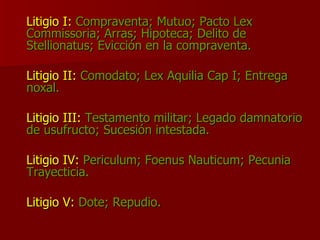 El documento presenta definiciones breves de diferentes conceptos jurídicos romanos relacionados con la compraventa, préstamos, hipotecas, sucesiones, responsabilidad civil y matrimonio. Entre ellos se encuentran la compraventa, el mutuo, el pacto de lex commissoria, la hipoteca, la evicción, el comodato, la lex Aquilia, el testamento militar, la sucesión intestada, el periculum, la pecunia trayecticia, la dote y el repudio.