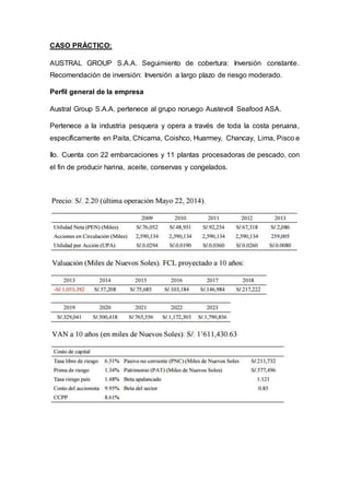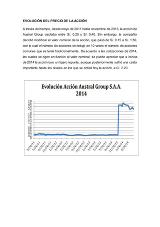 Austral Group S.A.A. es una empresa pesquera peruana que opera a lo largo de la costa peruana con 22 embarcaciones y 11 plantas procesadoras. Aunque el precio de su acción ha fluctuado entre S/. 0.20 y S/. 2.20, se recomienda invertir a largo plazo debido a que el valor actual por acción de S/. 8.18 es mucho mayor que el precio de mercado actual de S/. 2.20. Sin embargo, la volatilidad de los precios internacionales de la harina y el aceite de pescado,
