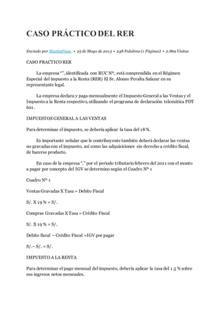 Este documento presenta un caso práctico sobre cómo una empresa clasificada en el Régimen Especial del Impuesto a la Renta (RER) debe determinar y pagar el Impuesto General a las Ventas (IGV) y el Impuesto a la Renta. Explica que para calcular el IGV, la empresa debe aplicar una tasa del 18% a sus ventas gravadas y restar los créditos fiscales por sus compras gravadas. También debe declarar ventas no gravadas y compras sin derecho a crédito fiscal. Para el Impuesto a la Renta, la tasa aplicable