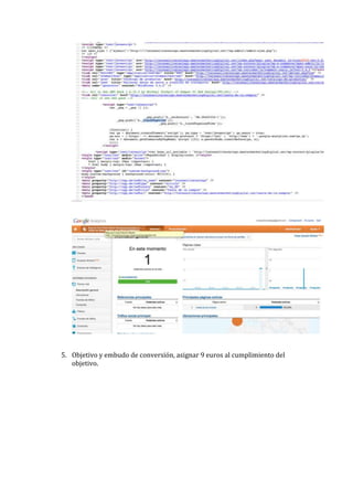 Este documento describe un caso práctico de Google Analytics para instalar objetivos y embudos de conversión en un sitio web de 5 páginas. Incluye crear una cuenta en Analytics, etiquetar el sitio con el código de seguimiento, documentar el proceso de verificación, y crear objetivos para una duración de visita mayor a 30 segundos y más de 4 páginas visitadas.