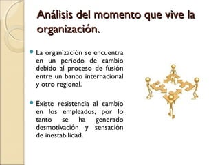 El documento analiza los desafíos de comunicación que enfrenta una organización bancaria que está pasando por un proceso de fusión. Identifica la resistencia al cambio entre los empleados y las barreras como la falta de información oficial, respuestas oportunas de los gerentes y rumores. También describe errores como omitir información a los trabajadores, falta de liderazgo comunicacional y segmentación de la información. Propone una campaña de sensibilización y motivación del personal para mejorar la situación.