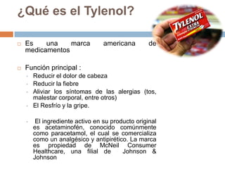 El documento describe la crisis de Tylenol de 1982, cuando siete personas murieron en Chicago después de consumir Tylenol adulterado con cianuro. Johnson & Johnson retiró de inmediato todos los productos Tylenol del mercado a un costo de $100 millones, y lanzó una campaña masiva de información para los consumidores. Estas acciones rápidas y responsables ayudaron a la compañía a recuperar la confianza del público y el 70% de las ventas de Tylenol en cinco meses.