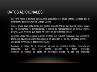 El documento describe la historia y las operaciones del grupo Inditex y su marca Zara. Fundado en 1974, Inditex ahora es un holding español con cuatro divisiones que incluyen fabricantes, distribuidores y oficinas en el extranjero. Zara se distingue por su modelo de negocio verticalmente integrado que le permite controlar toda la cadena de valor desde el diseño hasta la venta, lo que resulta en una mayor flexibilidad, rapidez e innovación. El uso de sistemas justo a tiempo y la constante renovación de su inventario también le permite