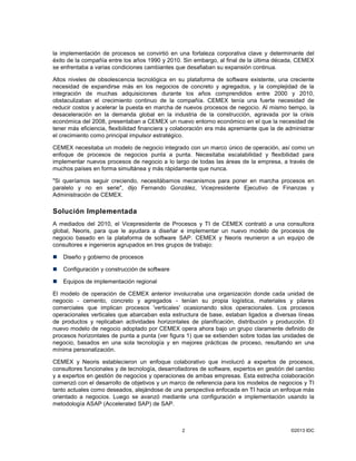 El documento describe la implementación exitosa de un modelo de optimización de procesos de negocio soportado por TI en CEMEX. CEMEX implementó con éxito un nuevo modelo basado en procesos horizontales punta a punta en toda la organización, apoyado por la plataforma SAP, lo que mejoró significativamente la agilidad, flexibilidad y competitividad de la empresa. La implementación redujo costos y aceleró la adopción de nuevos procesos en todas las unidades de negocio de forma simultánea.