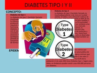 La diabetes es un proceso crónico que afecta a aproximadamente el 6% de la población. Existen dos tipos principales: la diabetes tipo 1 se debe a una deficiencia de insulina, mientras que la tipo 2 se debe a una resistencia a la insulina y suele asociarse con la obesidad. Los síntomas incluyen sed excesiva, micción frecuente y fatiga. A largo plazo puede dañar los órganos y causar complicaciones. El tratamiento se centra en controlar los niveles de glucosa a través de la di
