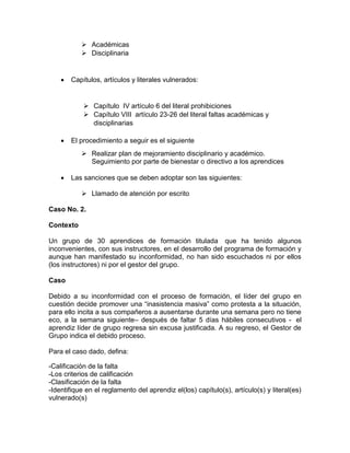 Este documento presenta 5 casos relacionados con aprendices del SENA. En cada caso se detallan el contexto, la falta cometida y se pide definir la calificación, criterios, clasificación, artículos del reglamento vulnerados y el debido proceso. Los casos involucran problemas de consumo de drogas, ausentismo, agresión física, falsificación de documentos y bajo rendimiento académico. Para cada caso se especifican las posibles sanciones como llamados de atención, condicionamiento o cancelación de matrícula de ac