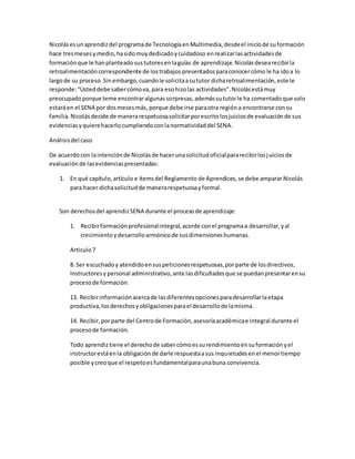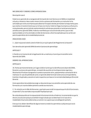 El documento trata sobre los derechos y deberes de dos aprendices del SENA. Federico no ha recibido su carné de aprendiz a pesar de ser un derecho, mientras que Nicolás desea recibir retroalimentación sobre su desempeño pero su tutor se niega a dársela. Ambos aprendices buscan ampararse en la normatividad del SENA para hacer valer sus derechos de manera respetuosa.