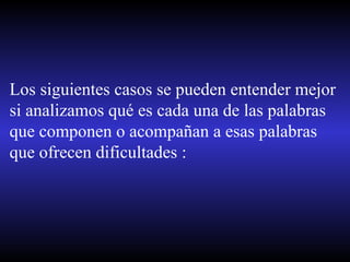 Este documento analiza cinco casos de palabras que pueden causar dificultades ortográficas: 1) "A VER" que son dos palabras separadas, 2) "HABER" que es un verbo que expresa obligación y forma frases compuestas, 3) "HA" que es la tercera persona del presente de "HABER", 4) "¡AH!" que es una interjección, y 5) "A" que es una preposición que puede ir delante de un nombre o entre dos verbos formando una perífrasis verbal.