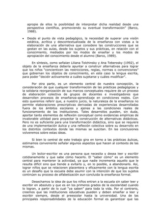 Este documento describe la necesidad de transformar las prácticas de enseñanza de lectura y escritura para lograr que los niños disfruten y dominen la lengua escrita. Actualmente, los resultados escolares no cumplen con los objetivos y muchos adultos evitan usar la escritura. Se propone considerar los conocimientos que los niños traen de su contexto extraescolar y desarrollar proyectos institucionales que promuevan la alfabetización de manera significativa.