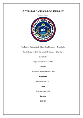 Este documento presenta los requisitos para una tarea sobre el uso de navegadores y marcadores sociales para la asignatura Infopedagogía. Se pide capturar imágenes de 5 elementos: 1) un favorito de una base de datos relacionada a la asignatura en el administrador de favoritos, 2) una página web guardada en My Library de Diigo, 3) una lista sobre turismo en Ecuador en My Outliners de Diigo, 4) la creación de un equipo de trabajo en Diigo, y 5) una búsqueda de la palabra "turismo" en
