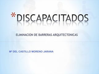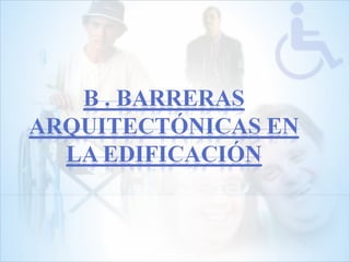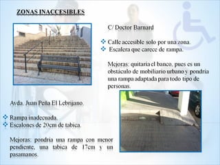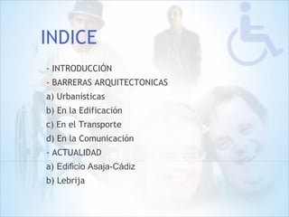 Este documento describe las barreras arquitectónicas y cómo eliminarlas para mejorar la accesibilidad. Las barreras se clasifican en cuatro grupos: urbanísticas, en edificios, en transporte y comunicación. También analiza ejemplos recientes en Cádiz y Lebrija que han mejorado la accesibilidad eliminando barreras como la instalación de rampas, ascensores y baños accesibles.
