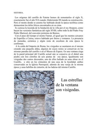 El castillo de Fatetar se remonta al siglo X cuando fue mandado a construir por Abderramán III. Ha estado habitado desde la época neolítica. Pasó a manos cristianas en el siglo XIII y ha tenido varios dueños a lo largo de la historia. Actualmente contiene restos arquitectónicos de las diferentes épocas por las que ha pasado, incluyendo visigodos, musulmanes y cristianos.