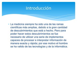 El documento describe varios dispositivos que han contribuido al avance de la medicina, incluyendo transductores de ultrasonido para diagnósticos no invasivos, electrocardiógrafos para monitorear la actividad cardíaca, marcapasos para regular los latidos del corazón, tomógrafos computarizados de rayos X, resonancias magnéticas nucleares, glucómetros, gasómetros, la técnica de PCR para amplificar ADN, equipos VAC para tratamiento de heridas, y monitores de signos vitales. Estos dispositivos han permitido real