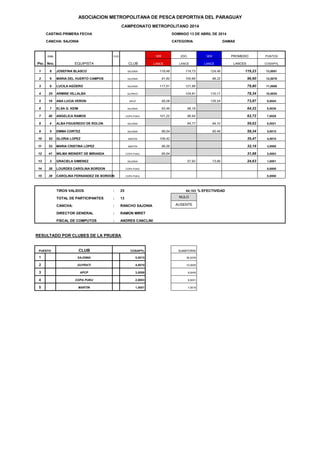Este documento presenta los resultados acumulados de dos fechas de competencia de casting en la categoría damas de un campeonato metropolitano de pesca deportiva en Paraguay en 2014. Se muestran las tablas de posiciones de los clubes y las participantes individuales ordenadas por puntaje total acumulado en ambas fechas. El Club Deportivo de Puerto Sajonia ocupó el primer puesto entre los clubes, mientras que Josefina Blasco fue la participante individual con mayor puntaje total.